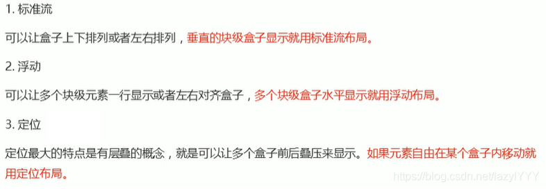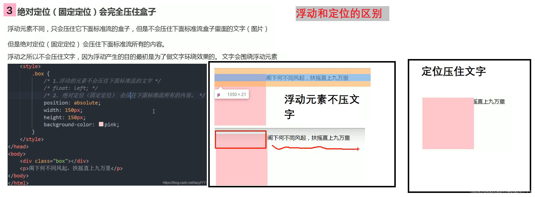 13.①定位(静态定位、相对定位relative、绝对定位absolute、固定定位fixed、粘性定位position:sticky;top:10px;)、②定位和浮动的区别、③页面布局总结