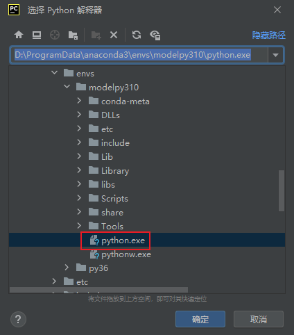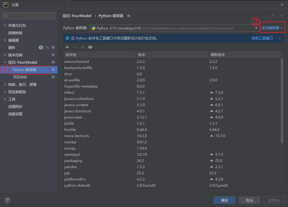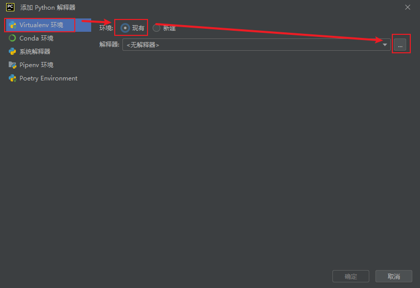 然后打开pycharm设置,点击【python解释器】-【添加解释器】,然后在添加解释器界面依次点击图中箭头所指的位置,最后在选择python解释器界面找到目标虚拟环境所在的文件夹,点击【python.exe】确定就结束了(虚拟环境所在的文件夹可以在第一张图查看虚拟环境中找到)。
