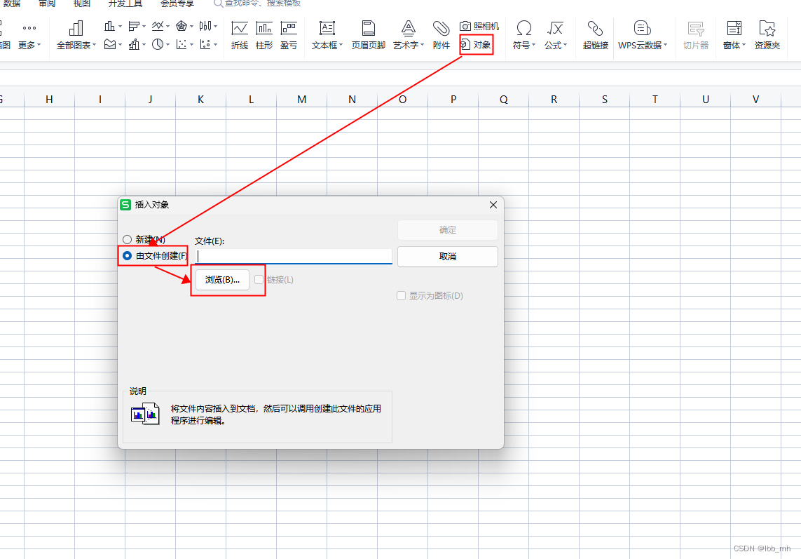 2.点击对象后,弹出框选择由文件创建,浏览,选择文件