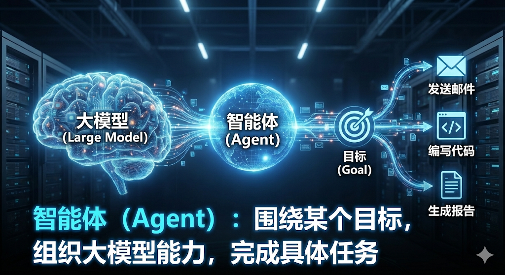 智能体 = 以大模型为核心,具备目标、策略和执行能力的应用形态