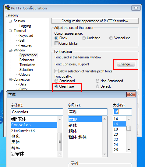 Window->Colours->Default Foreground->Modify设置(我喜欢绿色设置:R:0 G:255 B:64)