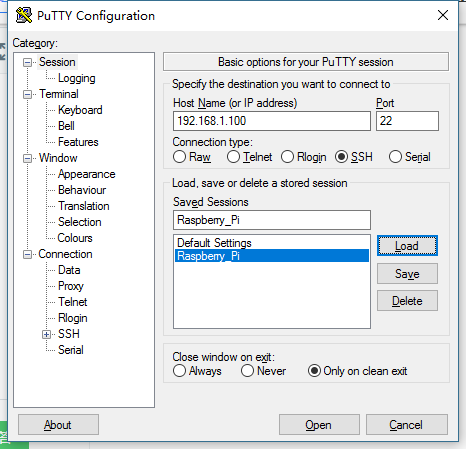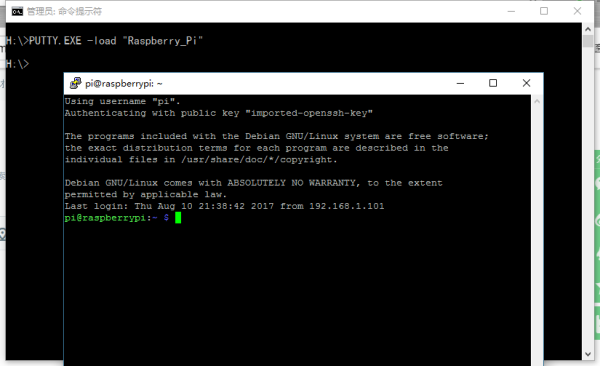 例如: C:\putty.exe -load "raspi" -ssh -l pi -pw raspberry