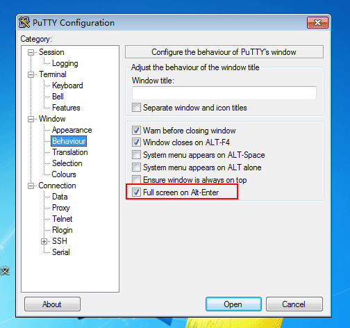 可是默认情况下这快捷键对Putty不起作用,还是需要配置,具体位置在category->window->Behaviour下,将System menu appears on ALT-Space前面的框选中就好了。