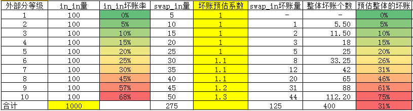 正常情况下,换入客群的坏账率要低于换出客群,根据经验前者一般是后者的60%-90%,会由于实际业务和模型效果的不同而略有差异。