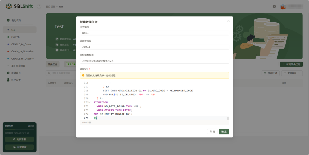 将一个超过 200 行的 Oracle 存储过程输入项目,点击“确定”开始转换,稍等片刻。