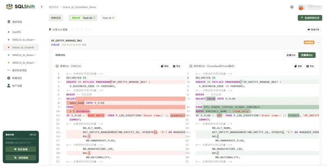 待任务完成,查看转换结果。通过“仅差异 SQL”,可快速浏览转换前后差异,以免鼠标滚冒烟,可以看到替换了全角符号、改造了 Oracle 特有视图 V$database,修改差异可以说是一览无余,清清楚楚。