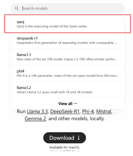 步骤二:回到ollama的官网,搜索框里搜索qwq,选择要安装的模型