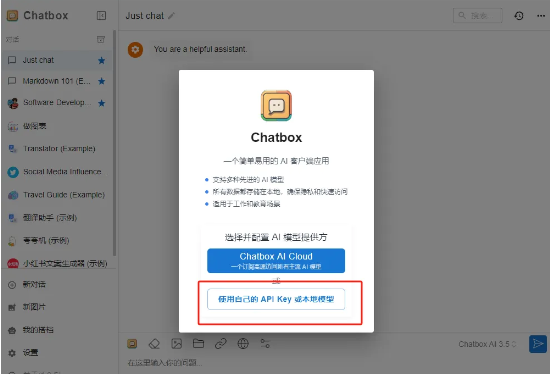 3. Chatbox安装好后,打开后,选择“使用自己的API Key或本地模型”。