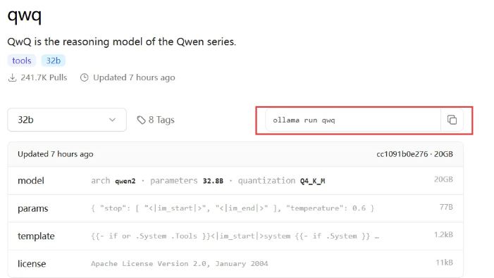 步骤三:复制右边的这串代码"ollama run qwq”