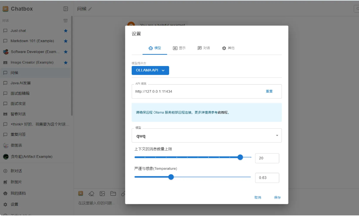 点击右下角的设置,设置好模型,选择OllamaAPI,最后选择已经安装好的模型就可以了。