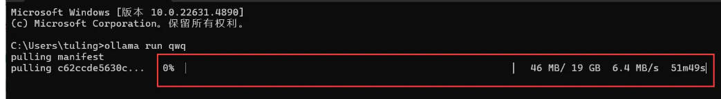 把复制的代码“ollama run qwq”粘贴到命令行中,再点击回车,如下图所示。