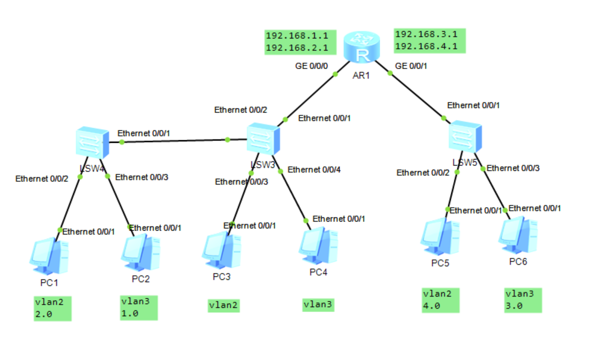 [Huawei-Ethernet0/0/1]port link-type trunk[Huawei-Ethernet0/0/1]port trunk allow-pass vlan 2 3