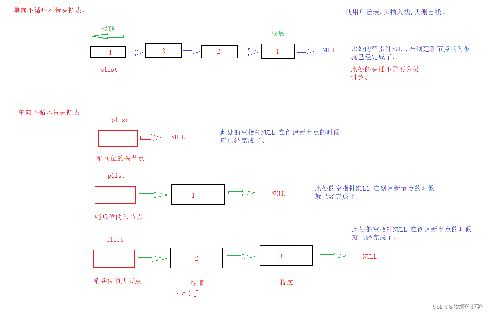 对于栈的实现,选择上面的结构都是可以的,若是选择最优的,则首先排除双向带头循环链表,是因为,能够使用单链表时,最好不要使用双链