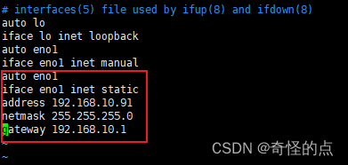 输入 vim /etc/network/interfaces,红框内的是添加的,其他事默认的,netmask 是子网掩码,eno1是网卡名称