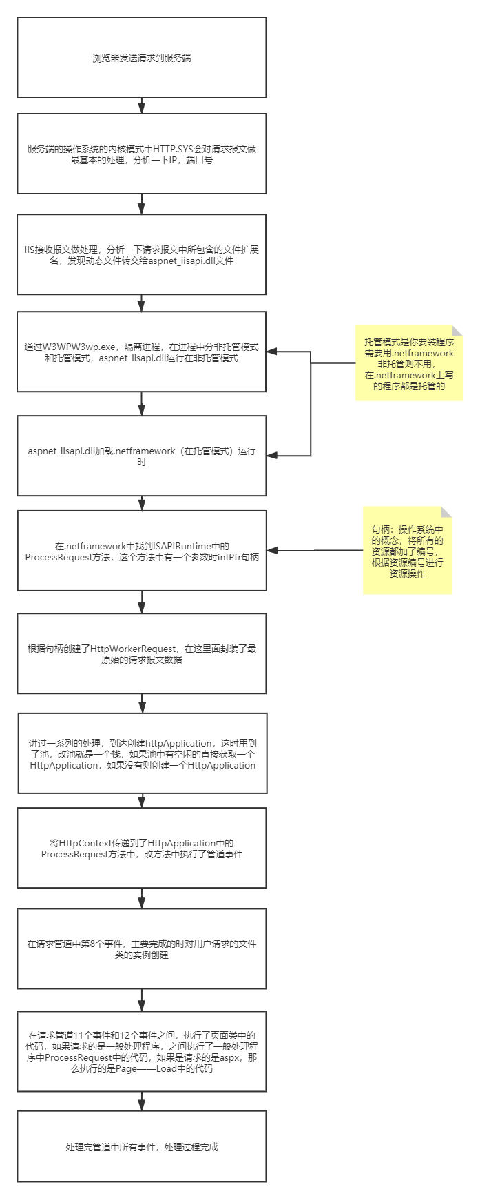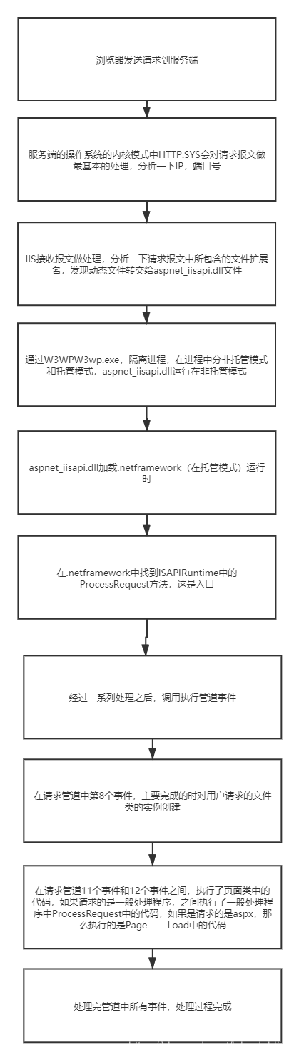 浏览器发送请求到服务端,服务端操作系统处理和IIS处理,到.Netframework中ISAPIRuntime这个入口,进行对报文的一系列处理,调用管道,进行实例化和代码的处理,处理完之后返回给浏览器