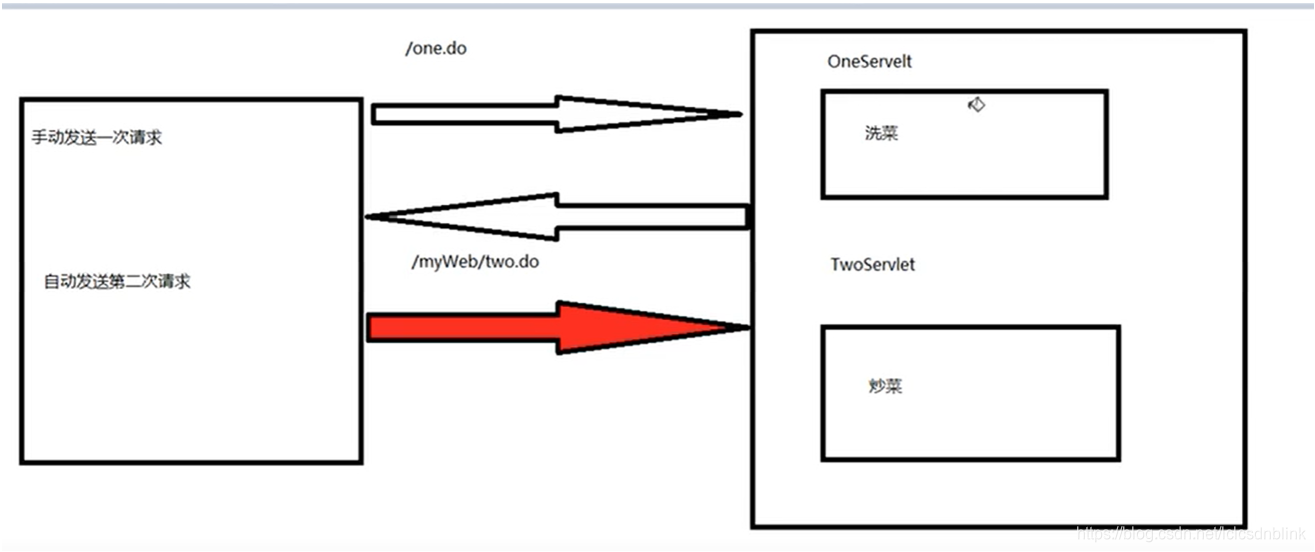 在第一个Servlet工作完毕后,将【第二个Servlet地址】推送给用户浏览器,由用户浏览器根据这个地址来【自动的】向第二个Servlet发送请求