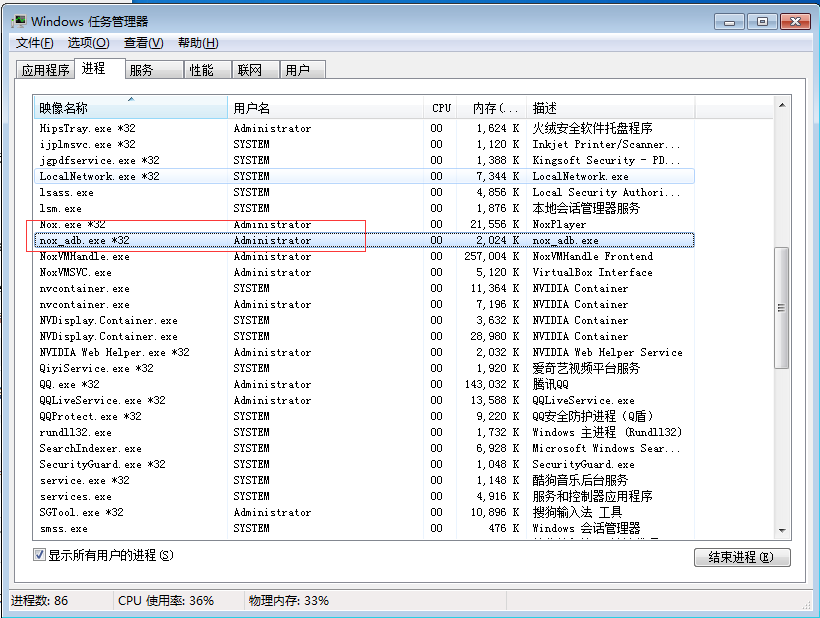在高版本的模拟器版本中,有时候会出现adb连接不上模拟器的情况,在这种情况下,现将电脑中的adb进程kill掉,如下图: