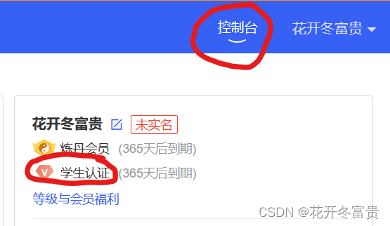 注册成功登陆后,点击右上角控制台,在点击学生认证,绑定成功后可以打折。(注意,学生认证需要使用教育邮箱,如果没有的话,可以跳过这一步了,毕竟学生也就95折)