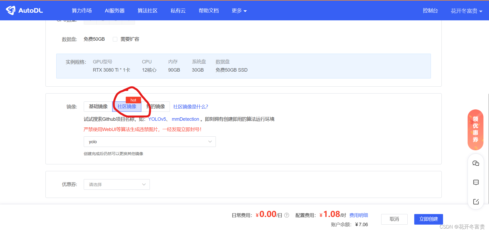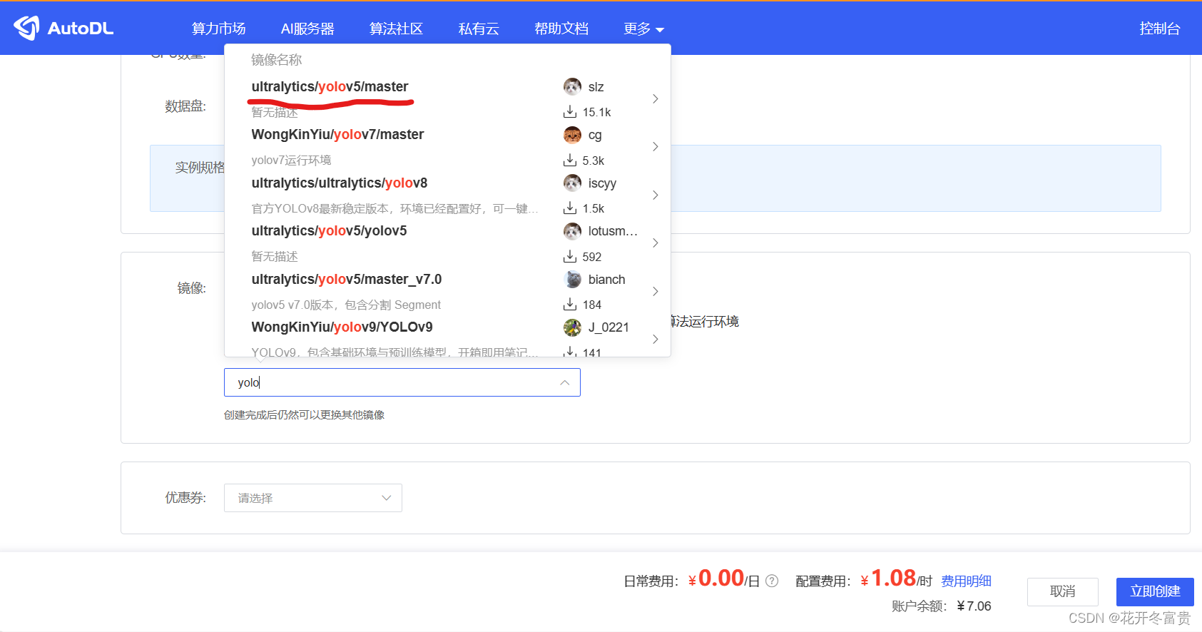 搜索yolo,根据版本选择对应的环境,不知道自己yolo版本的,可以选下载量最多的。点击立即创建即可。