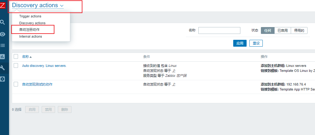 (1)自动注册∶zabblu.agent主动发送注册信息到server端,然后agent主机会被自动添加到web器,无须手动配置它们;