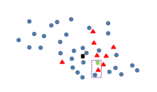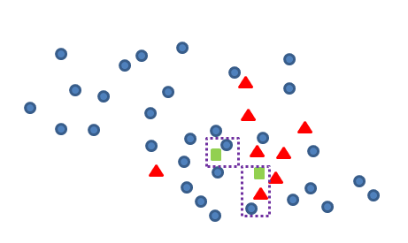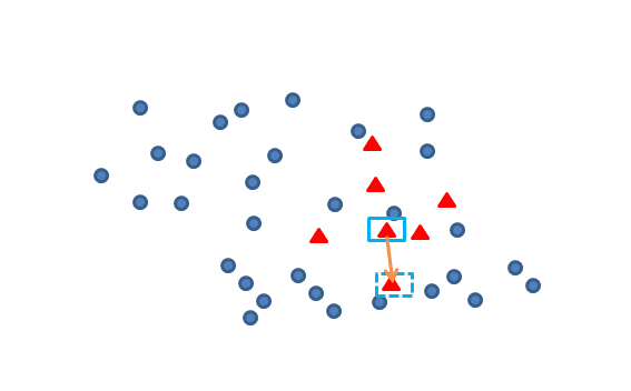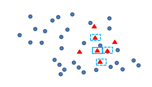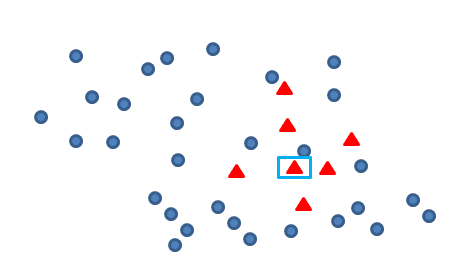 我们认为,对于新产生的青色数据点与其他非青色样本点距离最近的点,构成一对Tomek link,如下图框中的青蓝两点: