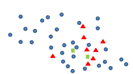Smote算法的思想其实很简单,先随机选定n个少类的样本,如下图: