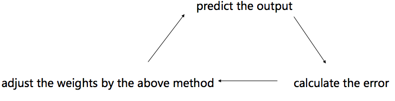 input ==> Σxw+b(线性变换) ==> f(Σxw+b)(激活函数) ==> ...(多层的话重复前面过程) ==> output(到此为止,正向传播结束,反向修正矩阵weights开始) ==> error=actual_output-output(计算预测值与正式值误差)==>output处的梯度==>调整后矩阵weight=当前矩阵weight+errorx学习速率xoutput处的负梯度。