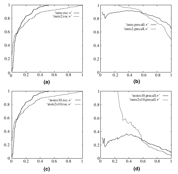 在上图中,(a)和(c)为ROC曲线,(b)和(d)为Precision-Recall曲线。(a)和(b)展示的是分类其在原始测试集(正负样本分布平衡)的结果,(c)和(d)是将测试集中负样本的数量增加到原来的10倍后,分类器的结果。可以明显的看出,ROC曲线基本保持原貌,而Precision-Recall曲线则变化较大。