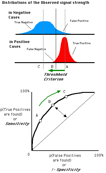 In signal detection theory, a receiver operating characteristic (ROC), or simply ROC curve, is a graphical plot which illustrates the performance of a binary classifier system as its discrimination threshold is varied.