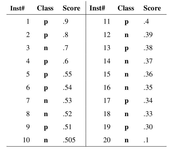 假如我们已经得到了所有样本的概率输出(属于正样本的概率),现在的问题是如何改变“discrimination threashold”?我们根据每个测试样本属于正样本的概率值从大到小排序。下图是一个示例,图中共有20个测试样本,“Class”一栏表示每个测试样本真正的标签(p表示正样本,n表示负样本),“Score”表示每个测试样本属于正样本的概率。