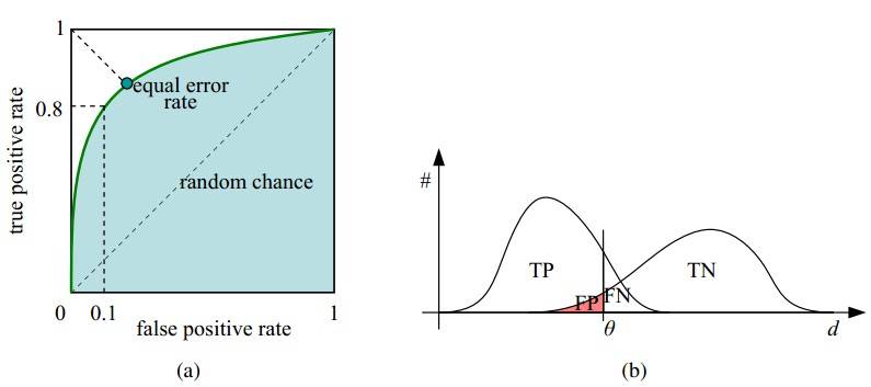 (b) P和N得分不作为特征间距离d的一个函数,随着阈值theta增加,TP和FP都增加。