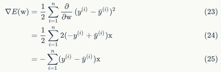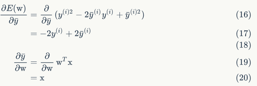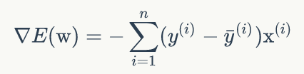 推导过程,我单独把它们放到一节中。您既可以选择慢慢看,也可以选择无视。在这里,您只需要知道,经过一大串推导,目标函数E(W)梯度是: