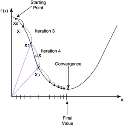 首先,我们随便选择一个点开始,比如上图的X0。接下来,每次迭代修改X的为X1,X2,X3......经过数次迭代后最终达到函数最小值点。