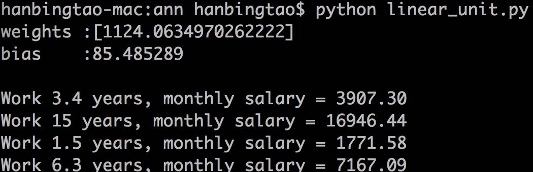 print 'Work 1.5 years, monthly salary = %.2f' % linear_unit.predict([1.5])