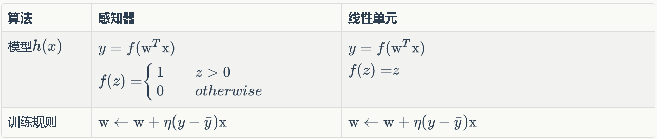 因为我们已经写了感知器的代码,因此我们先比较一下感知器模型和线性单元模型,看看哪些代码能够复用。