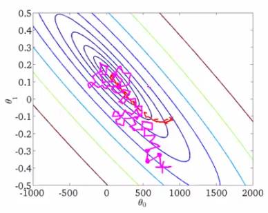 如上图,椭圆表示的是函数值的等高线,椭圆中心是函数的最小值点。红色是BGD的逼近曲线,而紫色是SGD的逼近曲线。我们可以看到BGD是一直向着最低点前进的,而SGD明显躁动了许多,但总体上仍然是向最低点逼近的。