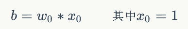 为了书写和计算方便,我们可以令W0等于b,同时令W0对应于特征X0,由于X0其实并不存在,我们可以令它的值永远为1。也就是说: