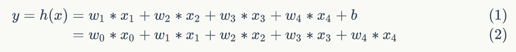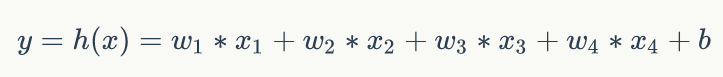 既然输入X成了一个具备四个特征的向量,相对应的,仅仅一个参数w不够用了,我们应该使用4个参数w1,w2,w3,w4,每个特征对应一个。这样,我们的模型就变成