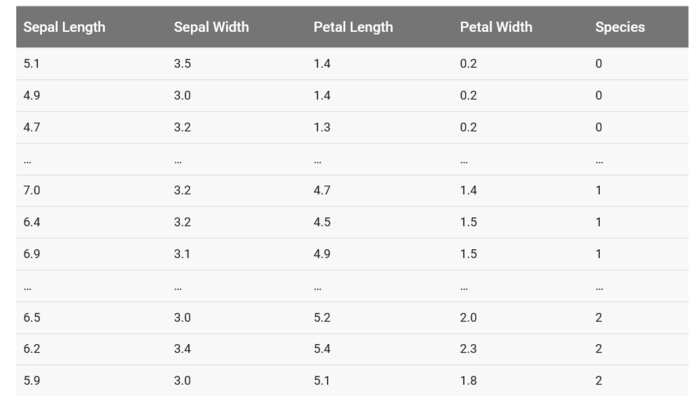 类别标签用整型数字表示:0表示萼片,1表示Iris versicolor,2表示Iris virginica