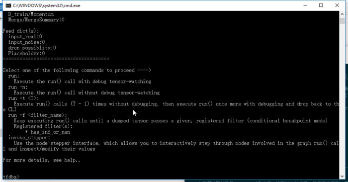 这是可以输入运行的指令(如果不清楚TensorFlow Debugger的指令,可以查看之前的教程https://www.jianshu.com/p/9fd237c7fda3)