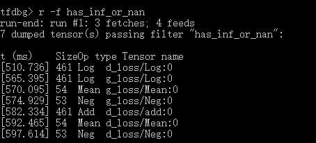 这样运行就会在有过滤器的情况下运行,并会捕获出现了过滤器指定数值的Tensor,我们这里指定的是出现了inf或者nan值的Tensor。运行后,结果如下图所示: