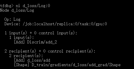 从结果中可以看到,这个张量有一个输入的张量Discrim/add_2,这个时候用指令pt查看下Discrim/add_2的数值,发现在调用tf.log计算前(就是输入到d_loss/Log:0节点前)的数值为-1.11897061e-05,然后调用tf.log就出现了nan,因为log计算定义域为正数。