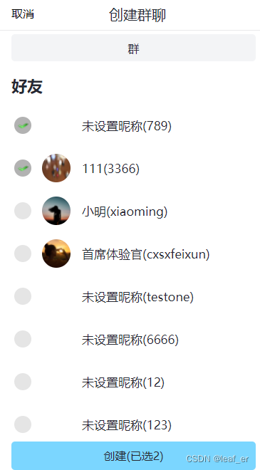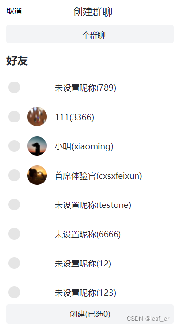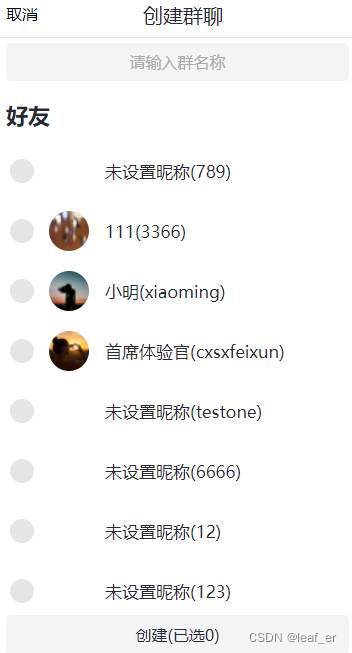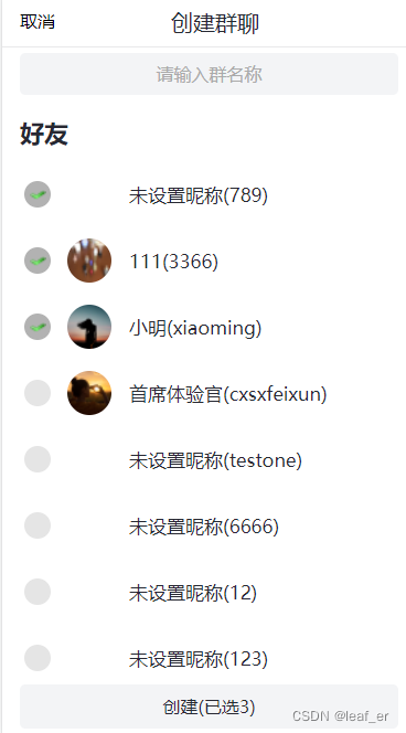 设置了一个变量记录已选择的人数,判断所选人数大于0且输入了群名称(群名称长度大于0)后创建按钮才不为灰;
