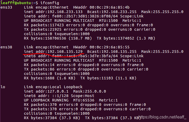 该过程在终端上输入ifconfig命令,然后查看ens38部分。如下图,可以发现该ip地址为192.168.135.129: