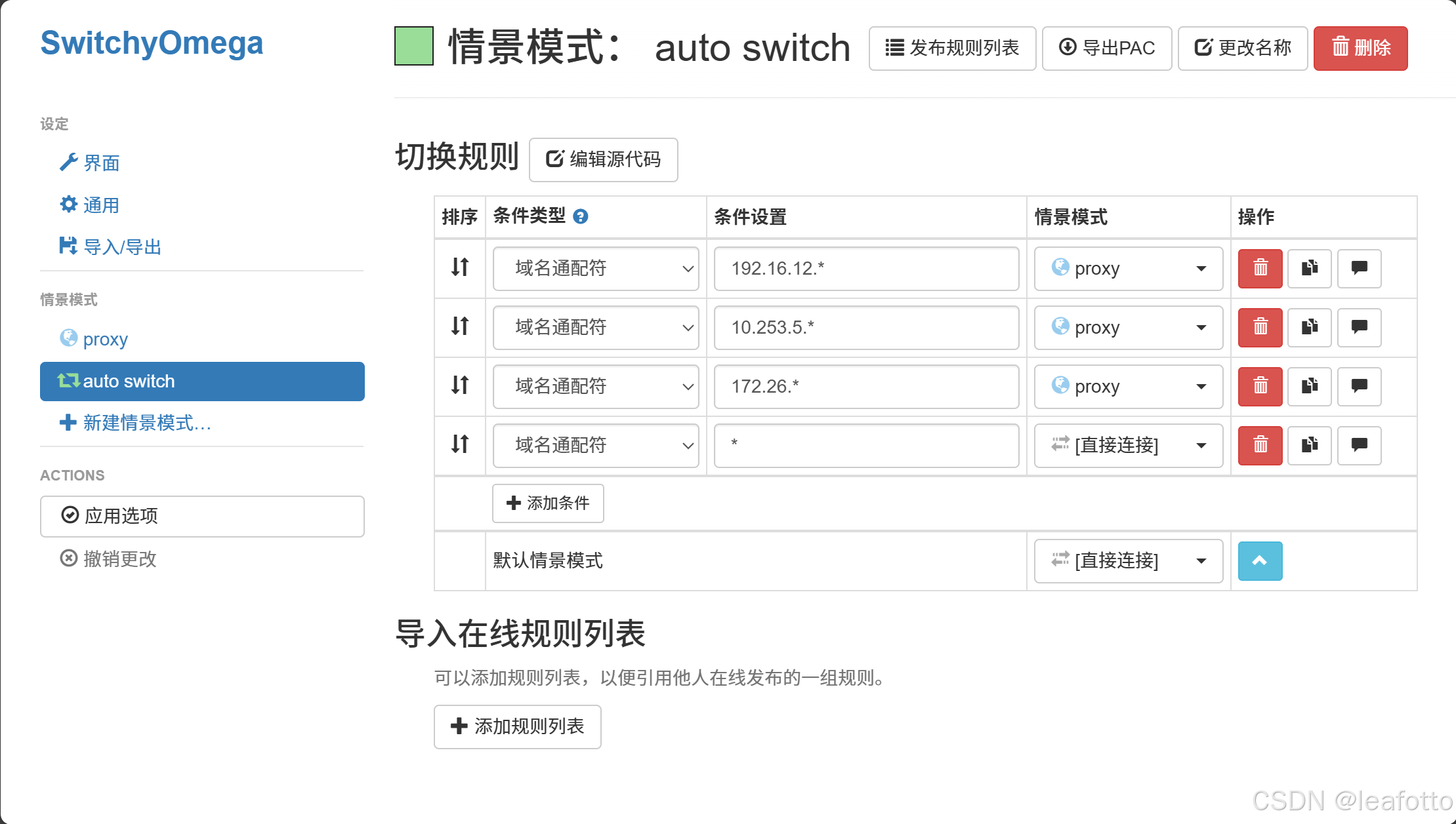 SwitchyOmega选择proxy后浏览器的全部流量就都走代理了,这样有些互联网的地址可能就无法访问了,所以可以使用auto switch,配置参考下图,这样除了通配符匹配的地址以外其他的流量就不通过代理了。