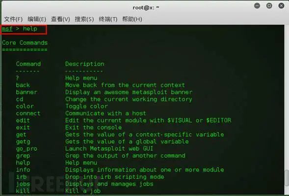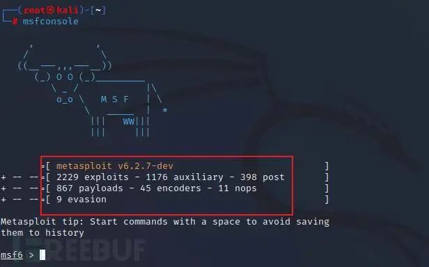 当打开msfconsole后,大家请看红色的方框。这里面清楚的标记了Metasploit所有的利用模块、payload等等