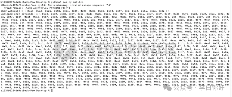 然后用python脚本生成aes加密的key和加密后的shellcode