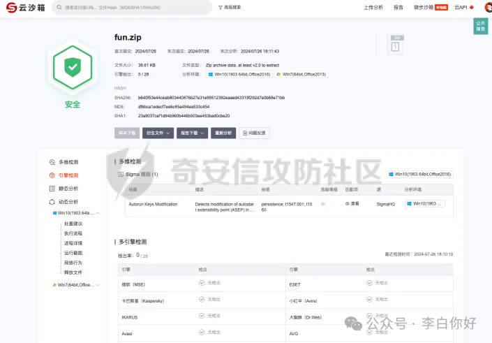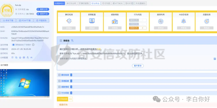 沙箱(Sandbox)是一种隔离机制,通过创建一个受控的、隔离的计算环境,允许软件在不影响宿主系统或网络的情况下运行和测试。这种技术在恶意程序分析中尤为重要,因为它能够安全地捕获和分析恶意软件的行为、特征及其对系统和网络的影响。在国内,常用的两个在线云沙箱分析平台是微步和安恒