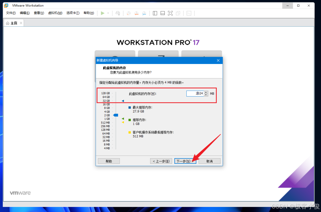 然后我们给虚拟机分配内存空间, 这里我们是为了学习为主,分配2GB~3GB就差不多了!