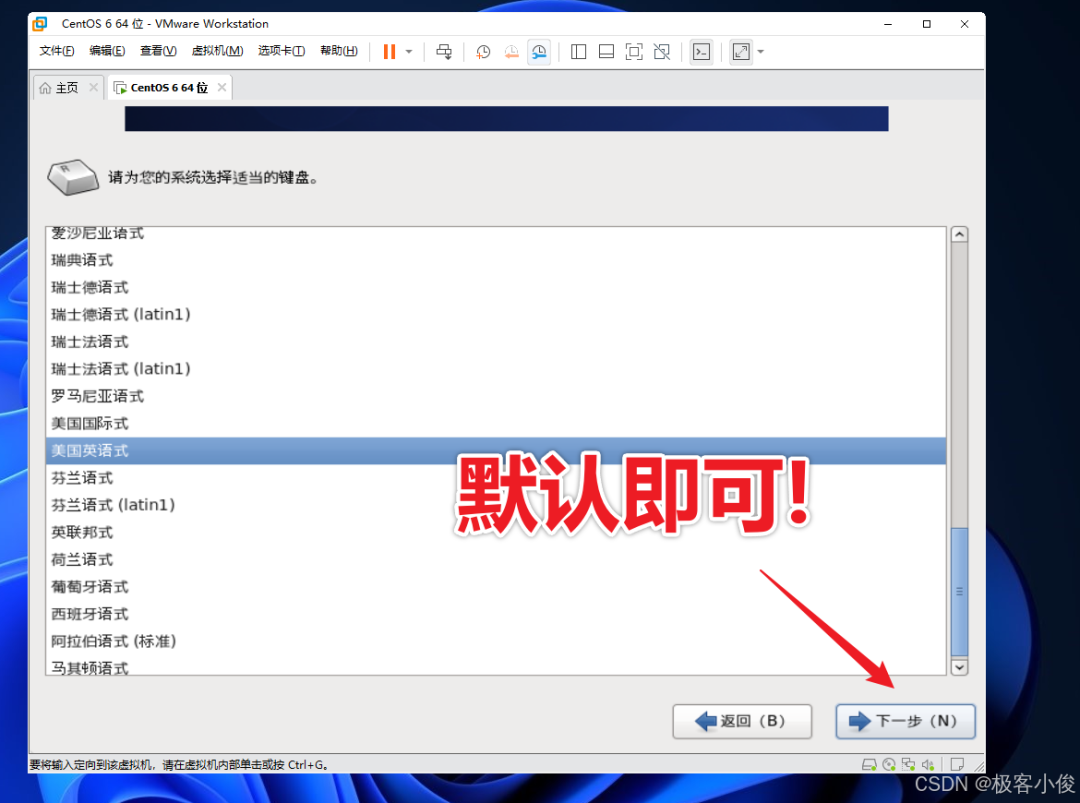 选择默认美国英国式键盘,点击Next(下一步)继续!